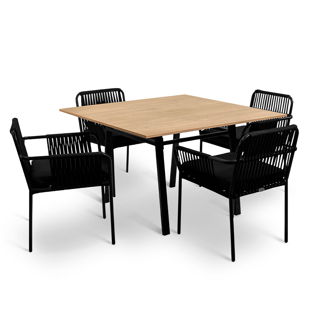 Incluye 4 sillas Chapala, una de las piezas más bellas y cómodas de nuestra colección, fabricada en estructura metálica pintada al horno y tejida con cordón de multifilamento de polipropileno de 6mm con cojín negro incluido.