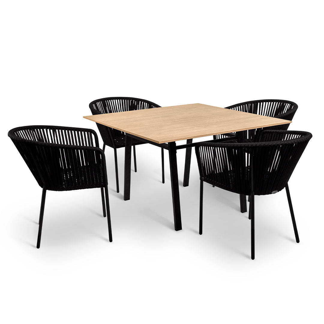 Nuestro bello Comedor Jalisco, será sin duda el lugar favorito de reunión en tu hogar. Mesa cuadrada, elaborada con tableros de alta calidad y una fuerte estructura de acero con pintura electroestática, con una base en forma de "A" que le brinda una máxima estabilidad.  Se acompaña con 4 sillas Jalisco, un modelo amplio y de vanguardia, cuyo diseño mezcla la estética y máxima comodidad. Fabricada en acero con pintura electroestática, tejida en cuerda plana de multifilamento de polipropileno con terminado UV de 16mm. También para uso exterior techado. Disponible en varias combinaciones de color de mesa y sillas. Nota:...