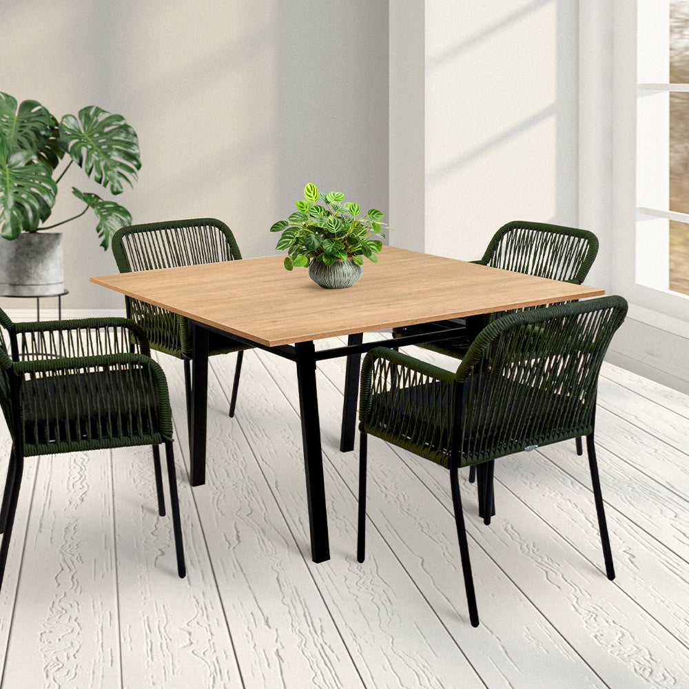 Incluye 4 sillas Mérida color verde olivo, una de las piezas más bellas y cómodas de nuestra colección, fabricada en estructura metálica pintada al horno y tejida con cordón de multifilamento de polipropileno de 6mm con cojín negro incluido.
