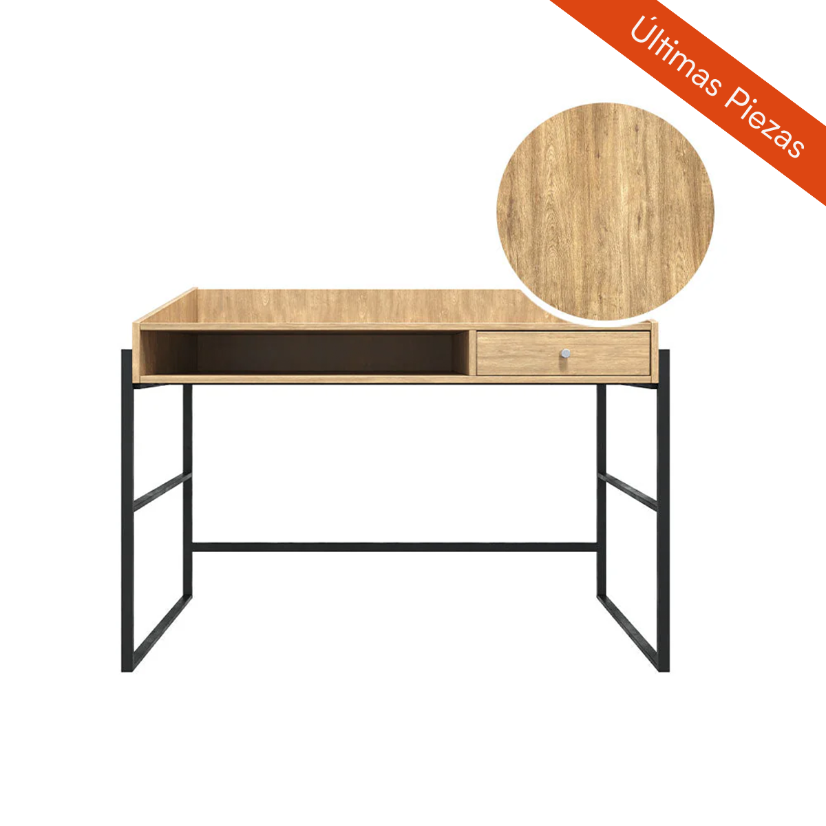 Escritorio tipo "secreter" con superficie y cajón del color elegido, con interior color lino y estructura armable de metal negro que da soporte al mueble.